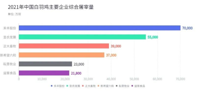 其中,禾丰食品股份有限公司、福建圣农发展股份有限公司、正大畜牧投资(北京)有限公司、新希望六和股份有限公司、沈阳市耘垦牧业有限公司、江苏益客食品集团股份有限公司6家企业为产业链综合屠宰排名前6名,2021年屠宰量均超2亿只。