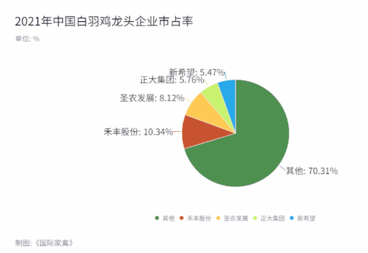 数据显示,2021年中国白羽鸡龙头企业市占率最高企业为禾丰股份10.34%。