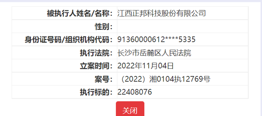 案号为(2022)湘0104执12769号的记录显示,立案时间为2022年11月04日,执行法院为长沙市岳麓区人民法院,被执行人名称为江西正邦科技股份有限公司,执行标的为22408076元。执行信息公开网还显示,截至发文,正邦科技存在数十条被执行人记录。
