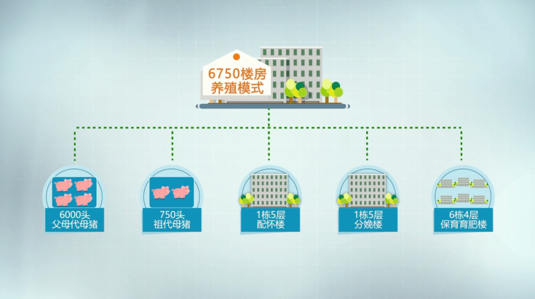 京基智农的养猪项目大多采用高标准的6750楼房养猪模式,其中“6750”中6代表着6000头父母代母猪,750代表着祖代母猪。一个6750模式包括6栋育肥楼、1栋分娩舍、1栋配怀舍。