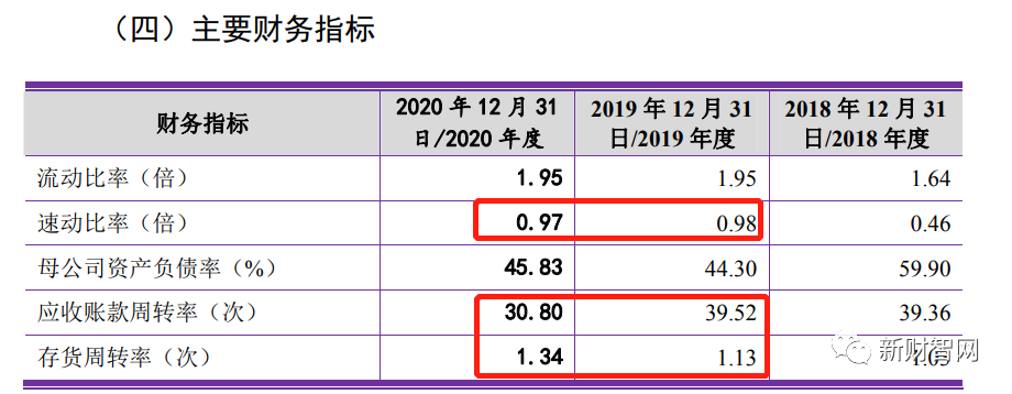 据美邦股份招股书,2019年、2020年美邦股份的速动比率(倍)分别为0.98、0.97.应收账款周转率(次)分别为39.52、30.80.存货周转率(次)分别为1.13、1.34.但在正邦作保的招股书却显示,2019年、2020年美邦股份的速动比率(倍)分别为1.09、1.06.应收账款周转率(次)分别为41.74、32.47.存货周转率(次)分别为1.18、1.41.
