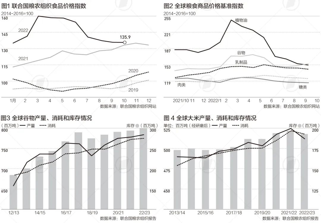 联合国粮农组织最新公布的数据显示,粮农组织食品价格指数(FFPI)10月平均为135.9点,与9月基本持平,较今年3月的历史高位下降14.9%。今年3月,受俄乌冲突影响,这一指数一度触及160点。