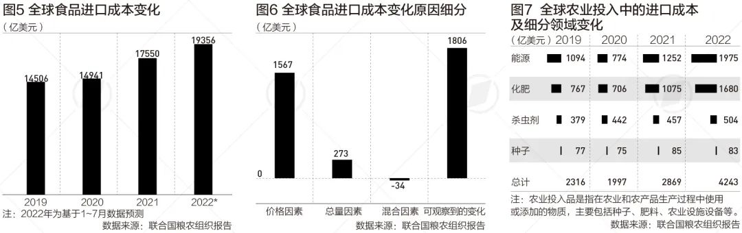 值得注意的是,联合国粮农组织认为,全球粮食进口费用的增加,并不是进口量的增加,最主要的原因是价格驱动。报告分析认为,在与去年粮食进口费用相比增加的超1800亿美元中,“价格因素”所导致的进口费用增加规模约为1570亿美元,而由交易量带动的仅273亿美元。由此可见,价格因素驱动的进口成本上涨约占整体的87%。