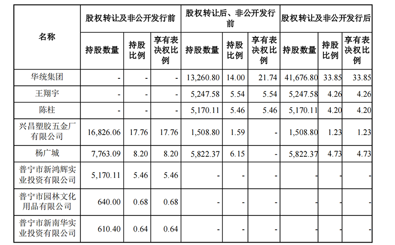 具体来看,11月17日,华统集团与兴昌塑胶五金厂签署《股份转让协议》,约定华统集团通过协议转让方式受让兴昌塑胶五金厂有限公司持有的高乐股份约1.326亿股无限售流通股份(占公司股本总额的14%),转让价格为2.187元/股,总转让价款为2.9亿元左右。