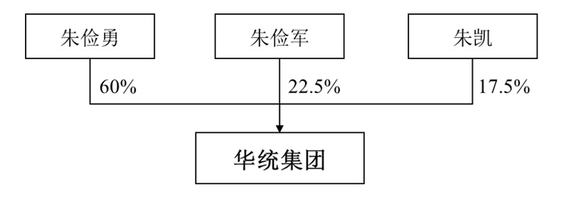披露显示,华统集团成立于2003年,注册资本5.00975亿元,朱俭勇持股60%,朱俭军持股22.5%,朱凯持股17.5%。华统集团的控股股东、实际控制人为朱俭勇、朱俭军,双方系兄弟关系。