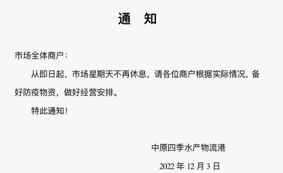 12月3日,河南中原四季水产物流港开始复工复产,且市场星期天不再休息。市场发货运输的热闹气氛逐渐复苏,商户恢复日常经营。