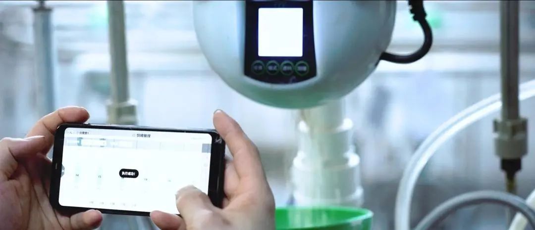 在这里,猪猪吃饭也不用“排队”,只见员工在APP上轻触某个按钮,一排排整齐有序的精喂仪就会收到指令自动下料。