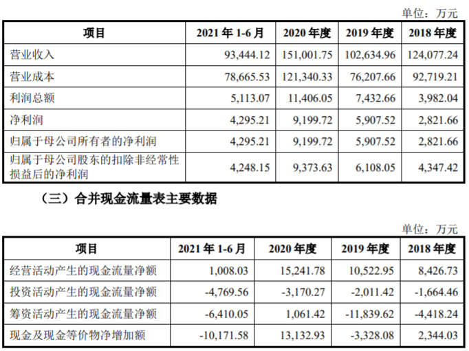 财务数据显示,2018年度、2019年度、2020年度和2021年1-6月,公司分别实现营业收入12.41亿元、10.26亿元、15.10亿元及9.34亿元,分别实现归母净利润2821.66万元、5907.52万元、9199.72万元及4295.21万元。