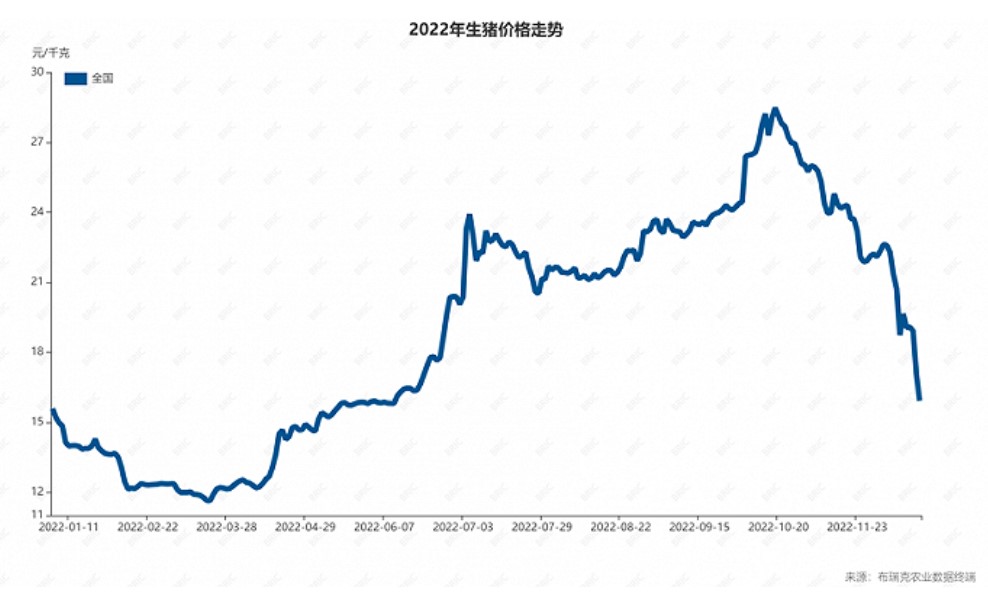 2022年,是猪价波动幅度约达300%的一年。布瑞克农业大数据报告显示,2022年1月1日至2022年12月20日,全国生猪均价最低为11.5元/公斤,最高28.5元/公斤,均价波动幅度在245%左右。而部分地区今年猪价最低出现10.8元/公斤,最高时则可达30.5元/公斤。