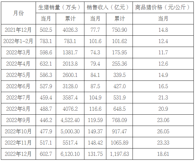 2022年12月份,公司商品猪价格相比11月呈现下降走势,商品猪销售均价18.61元/公斤,比2022年11月份下降20.23%。