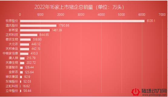 先看出栏量排名情况,2022年,16家企业合计出栏量为12920万头,其中有3家企业出栏量过千万,牧原6120.1万头遥遥领先,其出栏量接近另外15家企业总和,若按照2021年全国生猪出栏量67128万头计算,牧原占比也达到的9.1%。