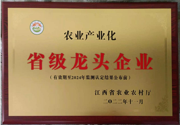 近日,经企业申报、县级初审、市级审查、省级评审等有关程序,播恩集团股份有限公司再次被江西省农业农村厅认定为江西省农业产业化省级龙头企业。