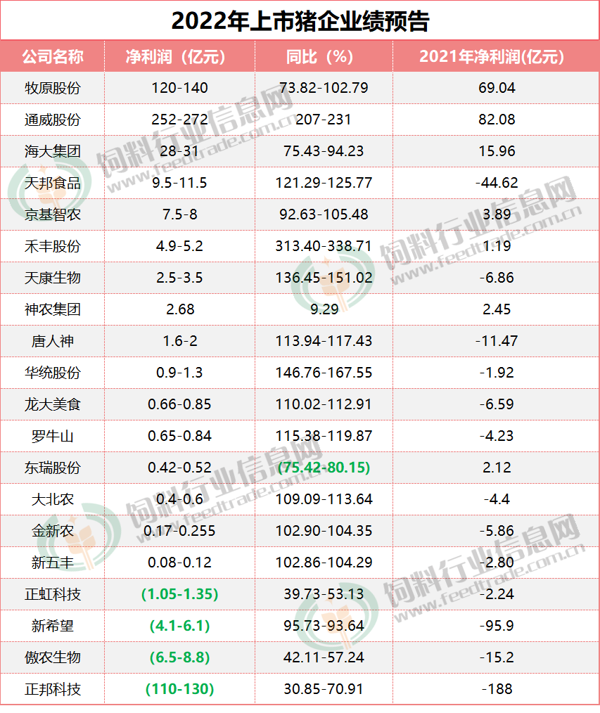 截止目前,共有20家上市农牧企业发布2022年业绩预告,因养殖成本和扩张节奏不同,头部猪企业绩出现分化,总体来看,有16家企业2022年盈利,只有正邦科技、傲农生物、新希望和正虹科技4家企业业绩亏损,但这4家企业同比2021年均大幅减亏。