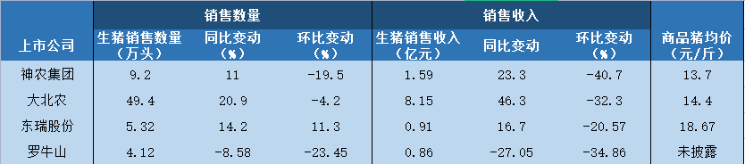 具体来看,神农集团、大北农生猪销售数量与收入同比均有增加,环比均下降;东瑞集团生猪销售数量与收入同比增加,销售数量环比增加,但销售收入环比下降;罗牛山生猪销售数量与收入数据同环比均大幅下降。