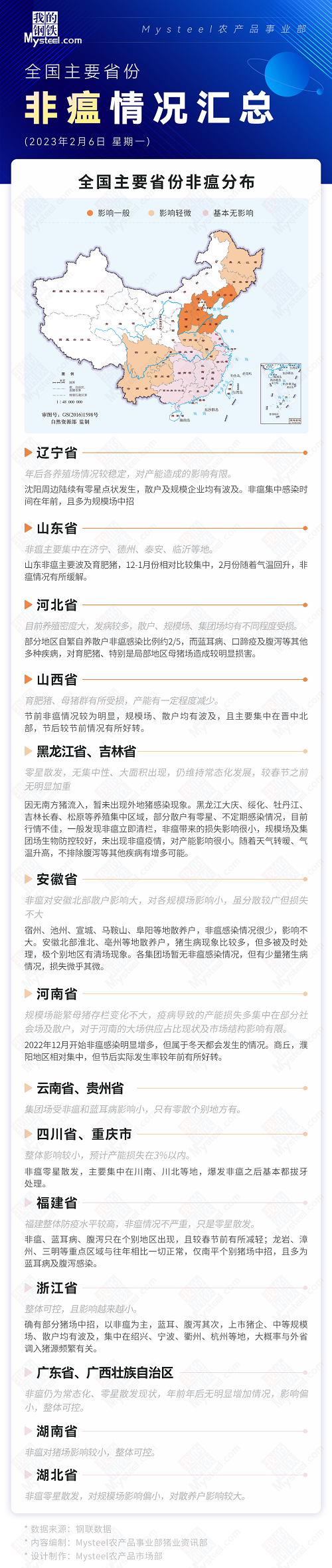广东省、广西壮族自治区:(非瘟仍为常态化、零星散发现状,年前年后无明显增加情况,影响偏小,整体可控。)