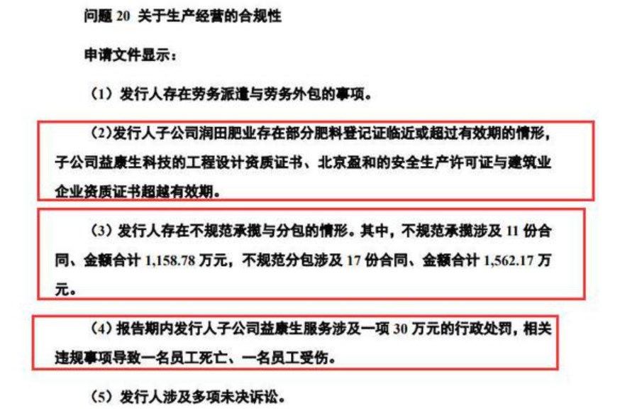 除上述合规性问题,深交所在问询函中还指出多出合规问题,包括“发行人子公司润田肥业存在部分肥料登记证临近或超过有效期的情形,子公司益康生科技的工程设计资质证书、北京盈和的安全生产许可证与建筑业企业资质证书超越有效期”、“发行人存在不规范承揽与分包的情形。其中,不规范承揽涉及 11 份合同、金额合计 1,158.78 万元,不规范分包涉及 17 份合同、金额合计 1,562.17 万元。”