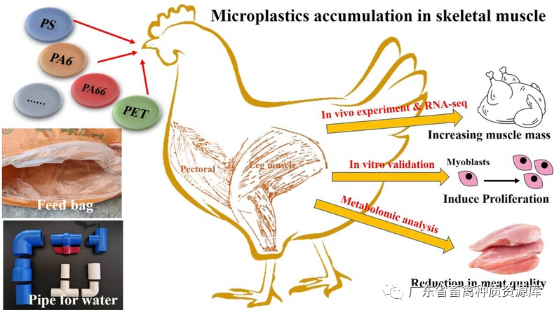 微塑料污染是全球性的环境问题,近年来相继在人类肺部和血液发现微塑料残留,引起广泛关注。禽肉是全球消费最多的肉食品之一,禽肉的安全对人类健康至关重要。前期研究发现家禽养殖场普遍存在微塑料污染,但尚未有研究报道微塑料会沉积到禽肉或其他组织器官中。本研究利用LDIR和PyGCMS两项先进的微塑料检测手段,首次在鸡场饲养的商品肉鸡肌肉、小肠和肝脏中发现微塑料残留。其中,残留量最高的是PA-6(尼龙),在肌肉中平均浓度达到约722.5mg/kg。进一步研究发现尼龙主要来自于饲料袋内膜,启示养殖场和饲料生产企业应提高饲料封装工艺,采用更环保安全的袋装技术,避免饲料被微塑料污染。通过系统的体内体外实验研究,发现微塑料暴露会刺激成肌细胞增殖、诱导细胞凋亡;长期的微塑料暴露则会引发肌肉和肝脏的慢性炎症,诱导肌肉肥大、降低肉质品质;结合转录组和代谢组学方法,发现长期微塑料暴露可显著改变宿主基因表达、影响组织的代谢进程。因此,微塑料残留会引发一系列严重后果,畜禽作为人类肉食品的重要来源,应从源头处预防微塑料的污染。