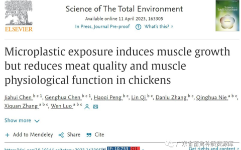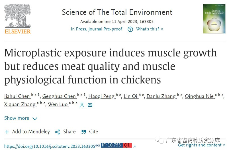 近日,华南农业大学动物科学学院家禽遗传育种研究团队在Science of the Total Environment(最新影响因子10.753,中科院一区TOP期刊)在线发表了题为“Microplastic exposure induces muscle growth but reduces meat quality and muscle physiological function in chickens”的研究论文。
