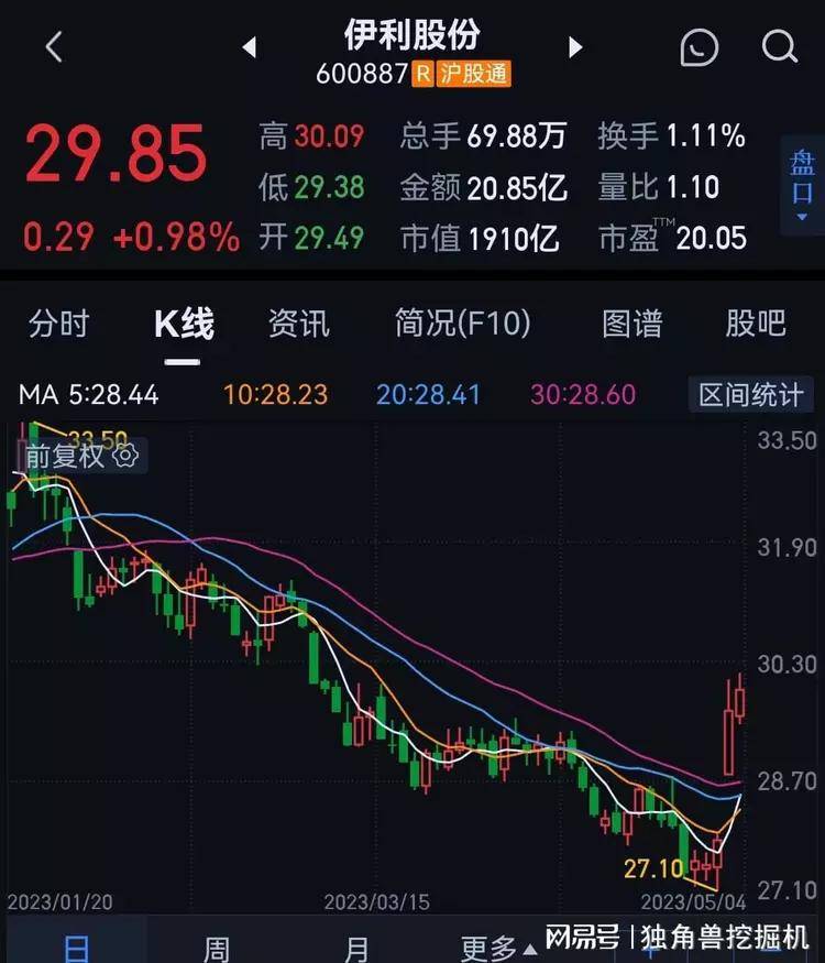4月27日晚,有“奶茅”之称的伊利股份发布了2022年财报,2022年实现总营收为1231.71亿元,同比增长11.37%;净利润为94.31亿元,同比增长8.34%。在财报发布后,伊利股价连涨2天,5月4日,收于29.85元,上涨0.98%。