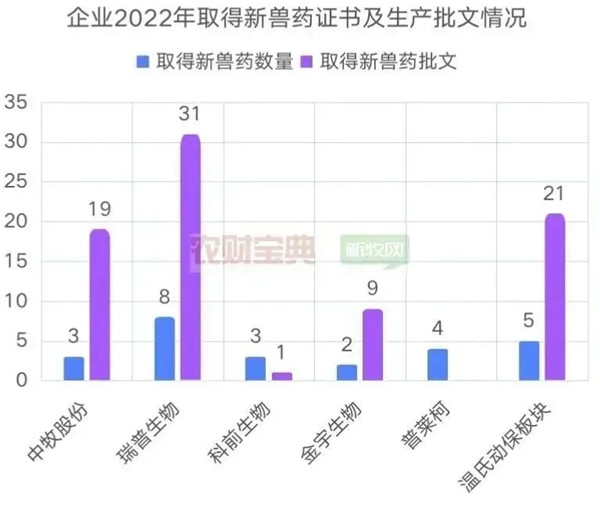 瑞普生物2022年取得新兽药证书和批文最多,分别为8个和31个。