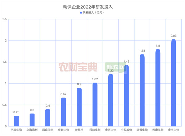 研发是动保企业竞争力核心。从研发来看,金宇生物2022年研发投入最高,达到2.03亿元,其次为天康生物,研发投入1.8亿元。