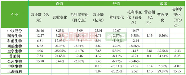 无论是经销还是直销,大部分企业毛利率均呈现下降。除金宇生物之外,其余企业经销毛利率下降幅度比直销更大——直销毛利率下降1-5个百分点不等,经销毛利率则下降在3-12个百分点。