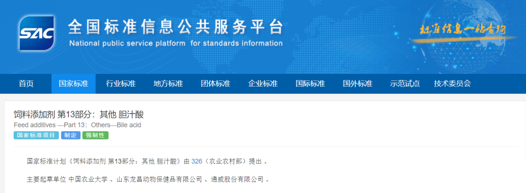 为了解决饲添胆汁酸质量和安全问题,帮助改善动物生产和食品安全, 326(农业农村部)提出国家标准计划《饲料添加剂 第 13 部分:其他 胆汁酸》,主要起草单位是中国农业大学、山东龙昌动物保健品有限公司、通威股份有限公司。