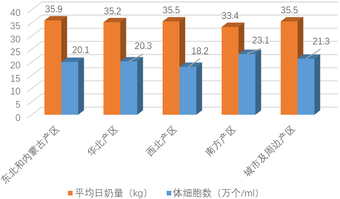 图6 2023年一季度不同产区测定日平均产奶量和体细胞数