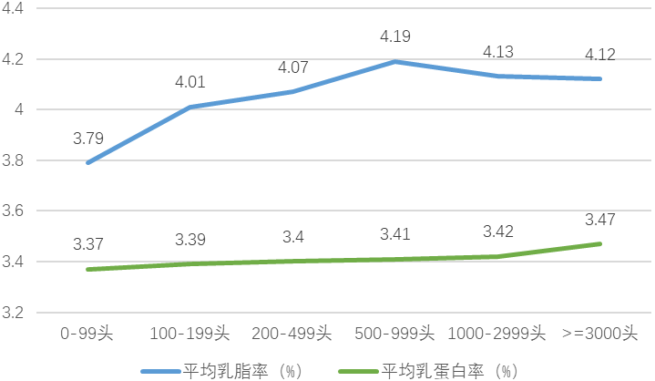 图11 2023年一季度不同泌乳牛规模场测定日平均乳脂率和乳蛋白率