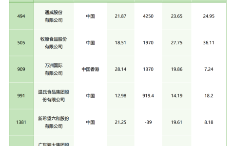 据国科团队统计,农牧、食品加工企业共21家入榜,其中农牧企业7家上榜,分别是通威股份、牧原股份、万洲国际、温氏股份、新希望、海大集团、云天化。