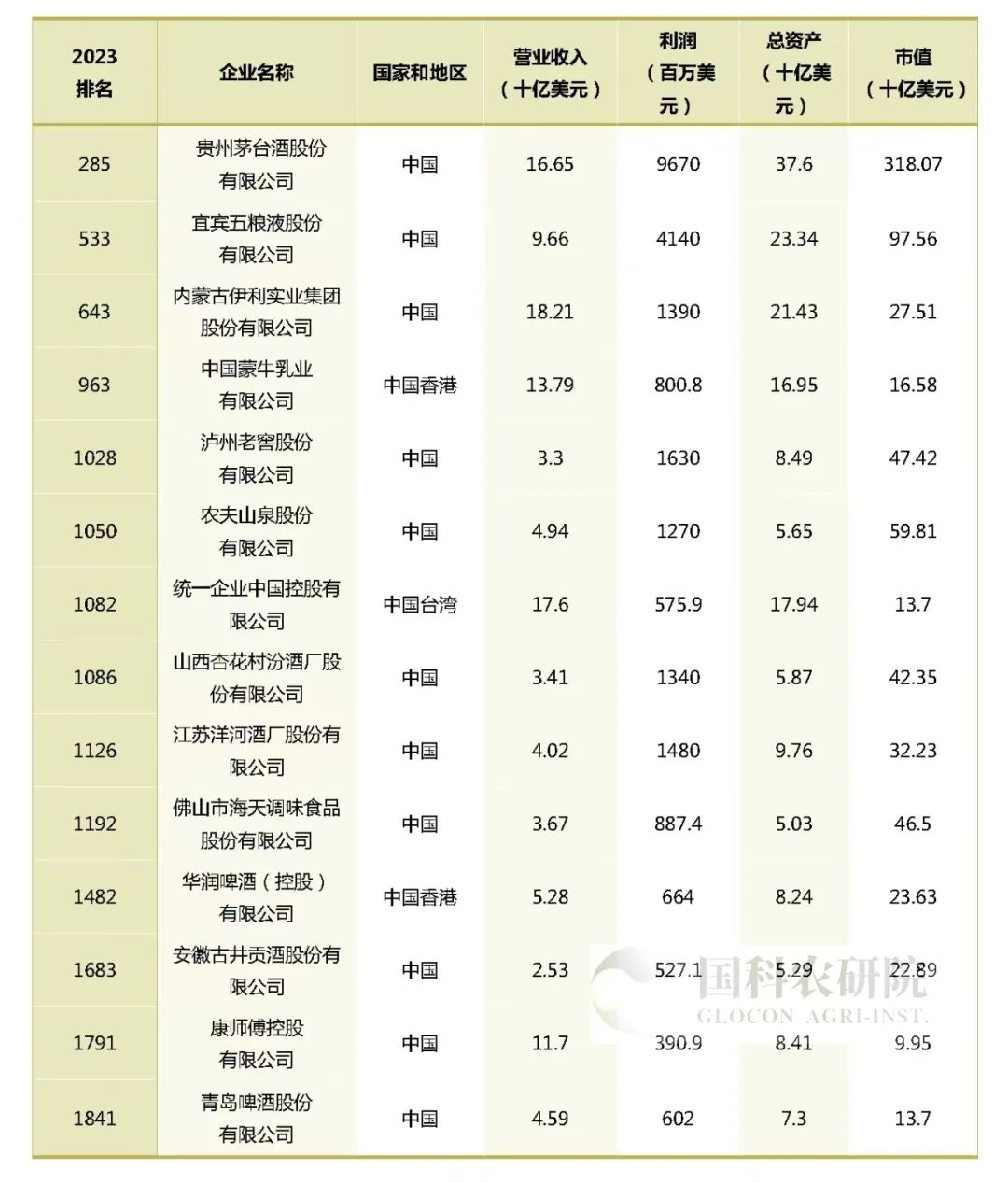 14家中国食品加工企业进入榜单,分别为:贵州茅台、五粮液、伊利股份、蒙牛乳业、泸州老窖、农夫山泉、统一企业中国、山西汾酒、洋河股份、海天味业、华润啤酒、古井贡酒、康师傅控股、青岛啤酒。