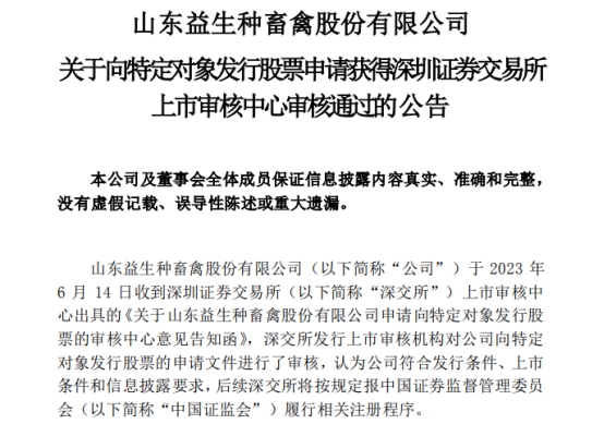 益生股份(002458.SZ)昨日晚间发布公告称,公司于昨日收到深交所上市审核中心出具的《关于山东益生种畜禽股份有限公司申请向特定对象发行股票的审核中心意见告知函》,深交所发行上市审核机构对公司向特定对象发行股票的申请文件进行了审核,认为公司符合发行条件、上市条件和信息披露要求,后续深交所将按规定报中国证券监督管理委员会(以下简称“中国证监会”)履行相关注册程序。