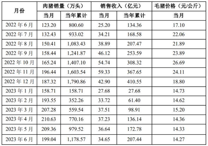 2023年6月,温氏股份销售肉猪199.04万头(含毛猪和鲜品),收入34.65亿元,毛猪销售均价14.27元/公斤,环比变动分别为-4.93%、-5.43%、-0.42%,同比变动分别为61.56%、37.50%、-16.55%。