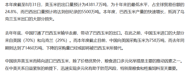 但随着俄乌危机爆发,以及巴西玉米的崛起,美玉米在全球贸易市场的主导地位正在减弱,巴西在与中国达成的新供应协议的帮助下,本年度玉米出货量将是自2013年以来,第二次超越美国,成为全球第一大玉米出口国。