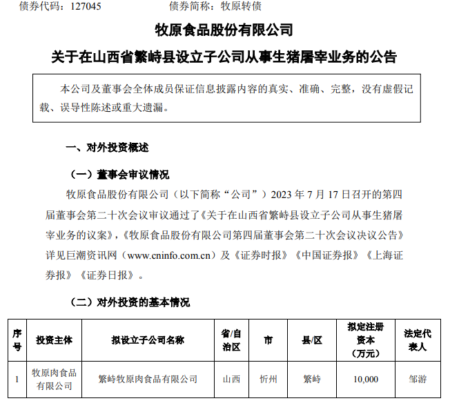 7月18日,牧原股份发布公告称,公司子公司牧原肉食品有限公司拟在山西省忻州市繁峙县设立子公司开展生猪屠宰业务,拟定注册资本1亿元,拟定公司名为繁峙牧原肉食品有限公司。