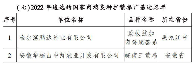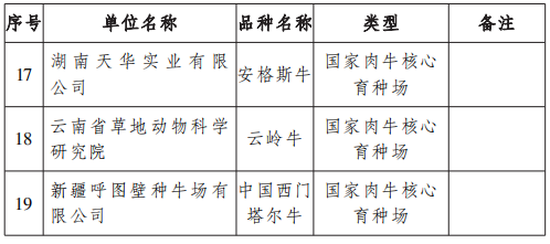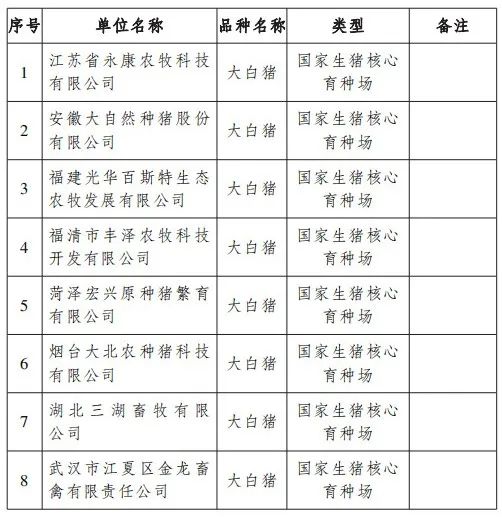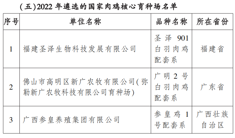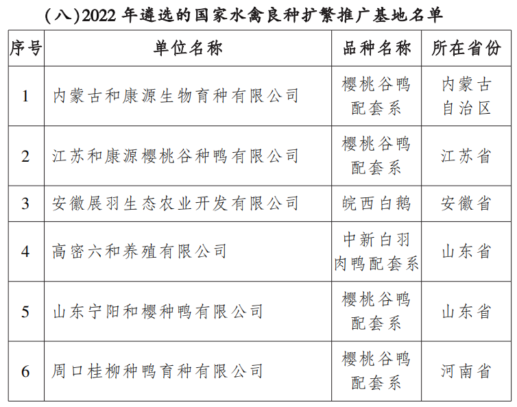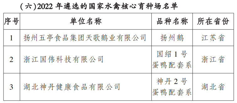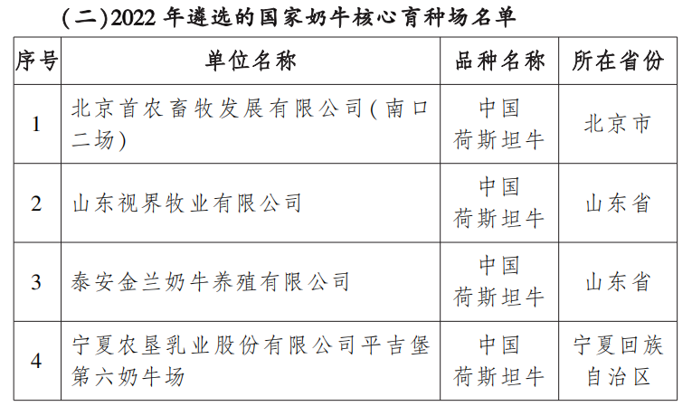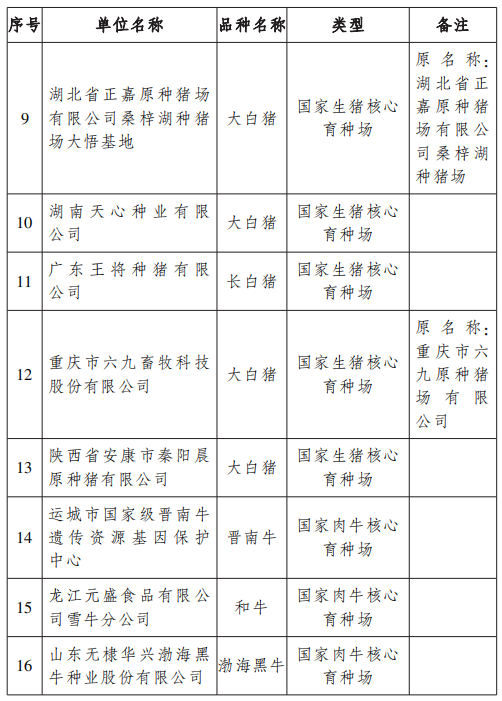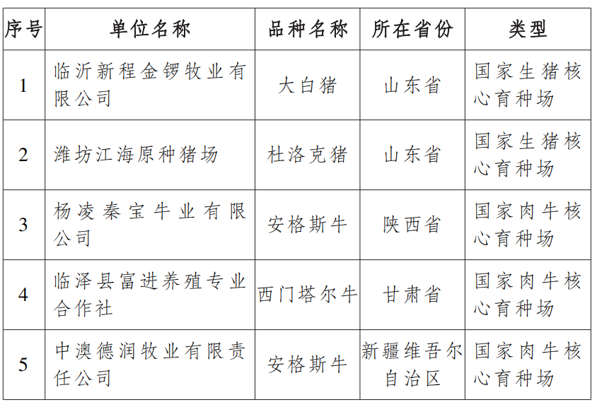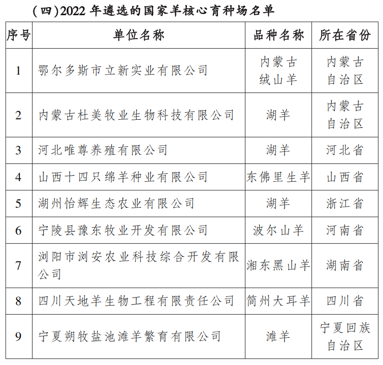 一、国家畜禽核心育种场、良种扩繁推广基地、核心种公猪站遴选结果。广德市三溪生态农业有限公司等9家企业为国家生猪核心育种场,北京首农畜牧发展有限公司(南口二场)等4家企业为国家奶牛核心育种场,内蒙古色也勒钦畜牧业科技服务有限公司等5家企业为国家肉牛核心育种场,鄂尔多斯市立新实业有限公司等9家企业为国家羊核心育种场,福建圣泽生物科技发展有限公司等3家企业为国家肉鸡核心育种场,扬州五亭食品集团天歌鹅业有限公司等3家企业为国家水禽核心育种场,哈尔滨鹏达种业有限公司等2家企业为国家肉鸡良种扩繁推广基地,内蒙古和康源生物育种有限公司等6家企业为国家水禽良种扩繁推广基地,吉安市傲宝生物科技有限公司等2家企业为国家核心种公猪站(见附件1)。