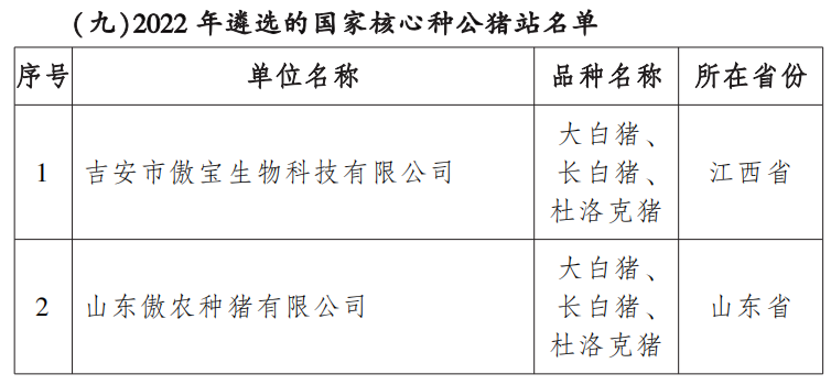 农业农村部办公厅关于公布2022年国家畜禽核心育种场等遴选核验结果和信息变更的通知