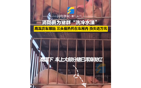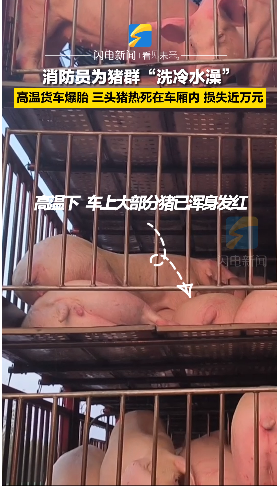2023年7月24日,山东省临沂市平邑县日兰高速上,一辆装载几十头活猪的货车因爆胎导致长时间停在高速上,车上大部分猪已经浑身发红,有活猪被高温致死情况,需要淋水降温。