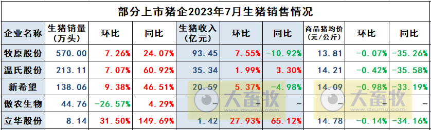 2、2023 年 7 月公司肉猪销售均价同比下降,主要为受国内生猪市场行情变化影响所致。