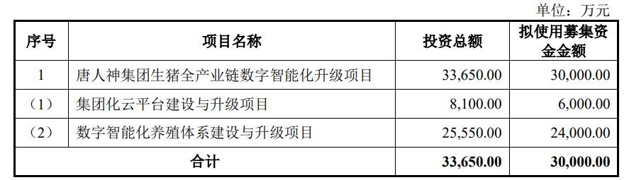 从唐人神6月27日发布的2023年度以简易程序向特定对象发行股票预案中了解到,此次募资主要用于唐人神集团生猪全产业链数字智能化升级项目,具体包括集团化云平台建设与升级项目和数字智能化养殖体系建设与升级项目两个子项。