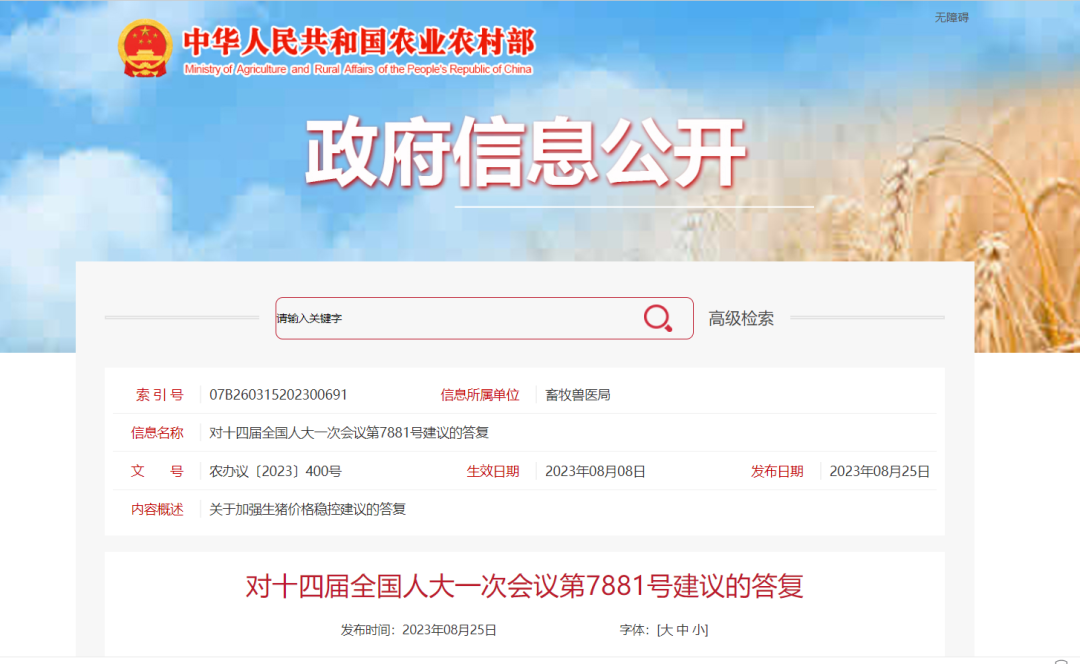 农业农村部在25日发布的《对十四届全国人大一次会议第7881号建议的答复》中回复了有关建立生猪价格保险机制和实施养殖大户奖补政策方面的问题。