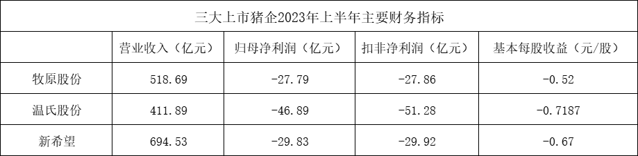 今年上半年,牧原股份和新希望都实现同比减亏,温氏股份同比亏损幅度有所扩大。