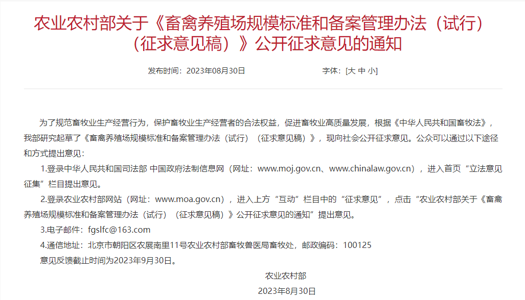 2023年8月30日,农业农村部发布《畜禽养殖场规模标准和备案管理办法(试行)》(征求意见稿)。