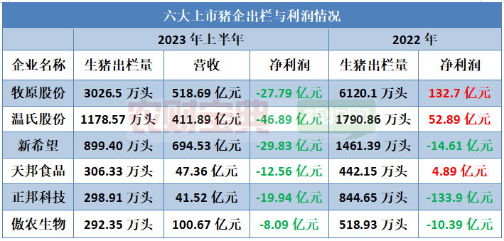 8月底,六大上市猪企陆续发布2023年半年度报告。今年上半年,牧原、温氏、新希望、天邦、正邦、傲农这六大上市猪企营收总和达1814.66亿元,其中牧原股份营收超500亿元,新希望营收接近700亿元。今年上半年,猪价持续低于成本线,六大猪企全部亏损,亏损总额为145.1亿元。