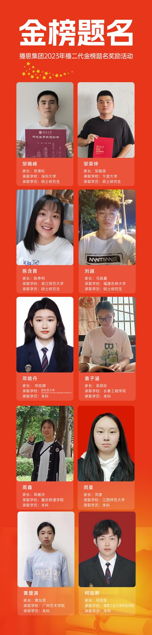 致辞结束后,就来到了最激动人心的金榜题名颁奖环节。本次活动,播恩集团为今年考取大学的10位播二代颁发了「播二代金榜题名奖学金」。