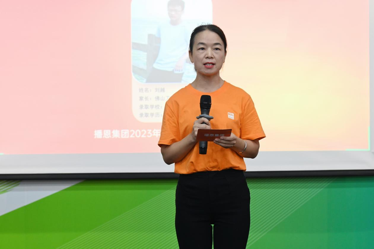 本次金榜题名颁奖典礼,还特别邀请到了刘越(福建农林大学 硕士研究生)的家长——马良赢(佛山工厂综合部综合员,2023最美播恩人)作为家长代表发言。她首先对集团一直以来提供的高水平员工福利表示衷心的感谢,从本次金榜题名活动中,她也感受到深深的员工关怀。她十分感谢集团提供了这样一个和大家分享喜悦的机会,并表示以后会更加珍惜自己的工作岗位,努力做更优秀的播恩人,努力培养孩子成长成材,最后祝集团发展越来越好,未来蒸蒸日上。