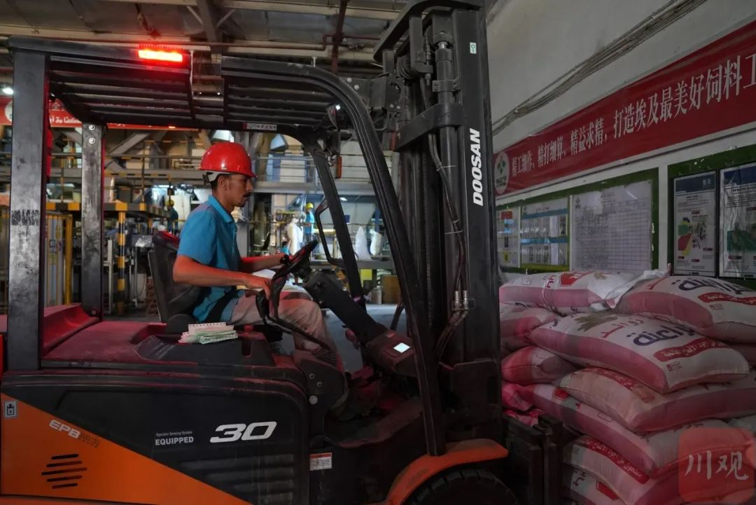 走进工厂里,工人们正驾驶着叉车,忙碌地搬运着饲料。厂房外,货车源源不断地将饲料运出,送往埃及各地的养殖场中,为当地养殖业发展提供助力。