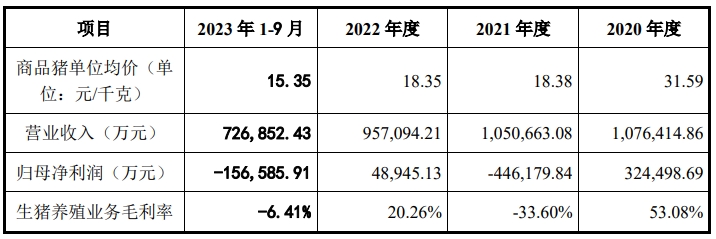 2020年生猪价格维持高位,天邦食品当年实现净利润32.45亿元,生猪养殖业务毛利率53.08%。2021年生猪价格回落,天邦食品当年净亏损44.62亿元,生猪养殖业务毛利率为-33.60%。公告称,近年来,随着经营规模逐渐扩大,公司通过增加有息借款等途径补充营运资金,借款余额大幅增加,资产负债率提高。同时,由于生猪价格波动导致经营业绩大幅波动,2021年、2022年和2023年前三季度,公司主营业务持续亏损,进一步提高了资产负债率,恶化了现金流状况。截至2023年9月30日,资产负债率为87.03%,短期借款余额269080.42万元,长期借款余额68875.82万元,一年内到期非流动负债余额128973.52万元。