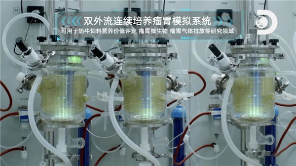 为了更好促进奶牛们的食欲,创新使用“人工瘤胃”机器通过模拟牛瘤胃的消化功能,辅助营养专家制定科学合理的日粮搭配,保证奶牛均衡营养。