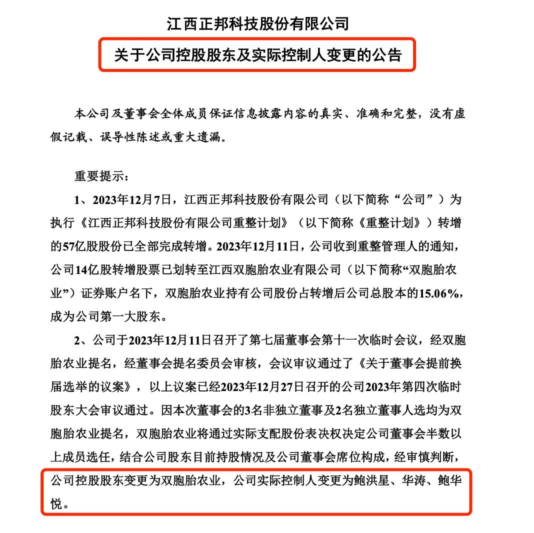 12月28日,*ST正邦发布公告称,结合公司股东目前持股情况及公司董事会席位构成,经审慎判断,公司控股股东变更为双胞胎农业,公司实际控制人变更为鲍洪星、华涛、鲍华悦。